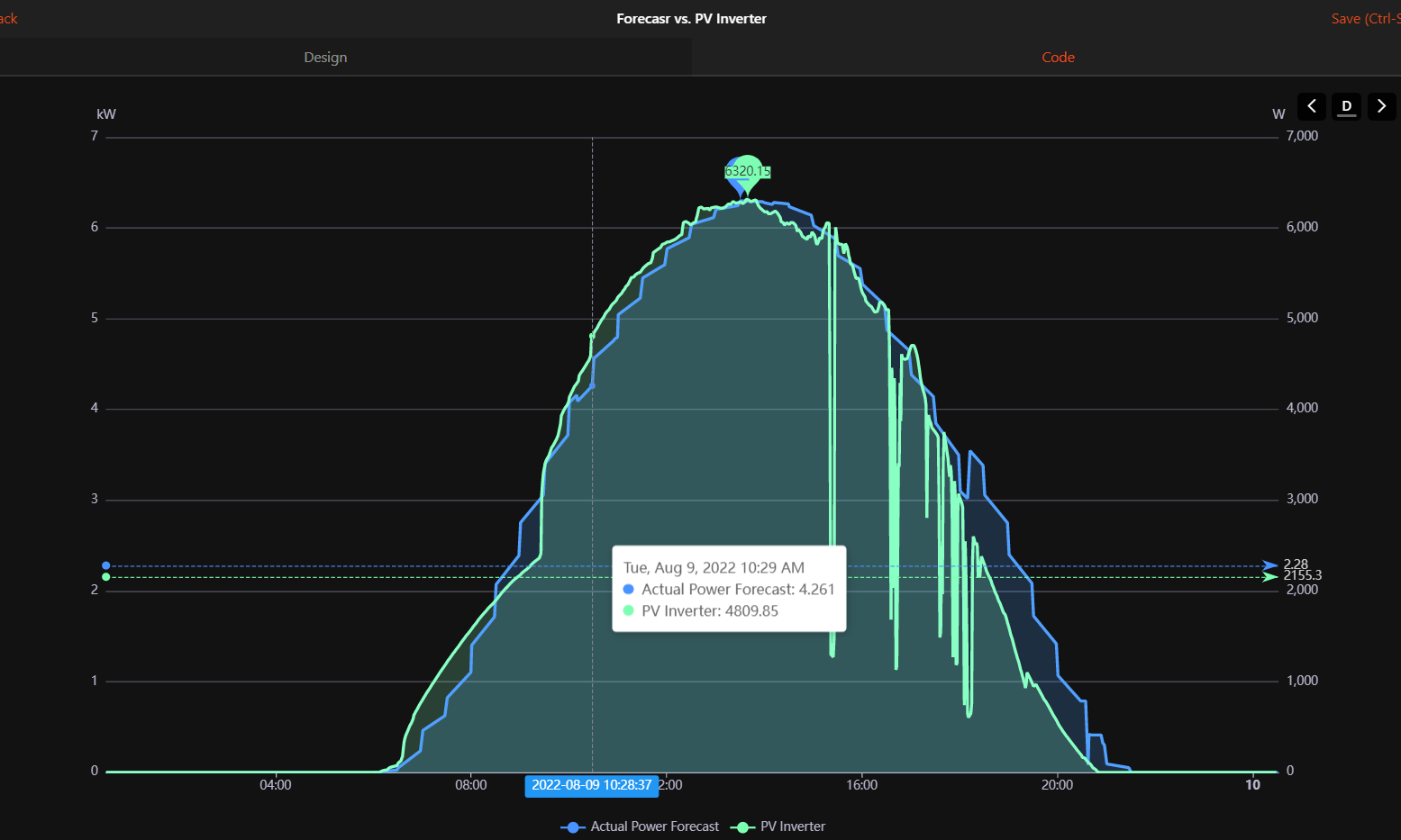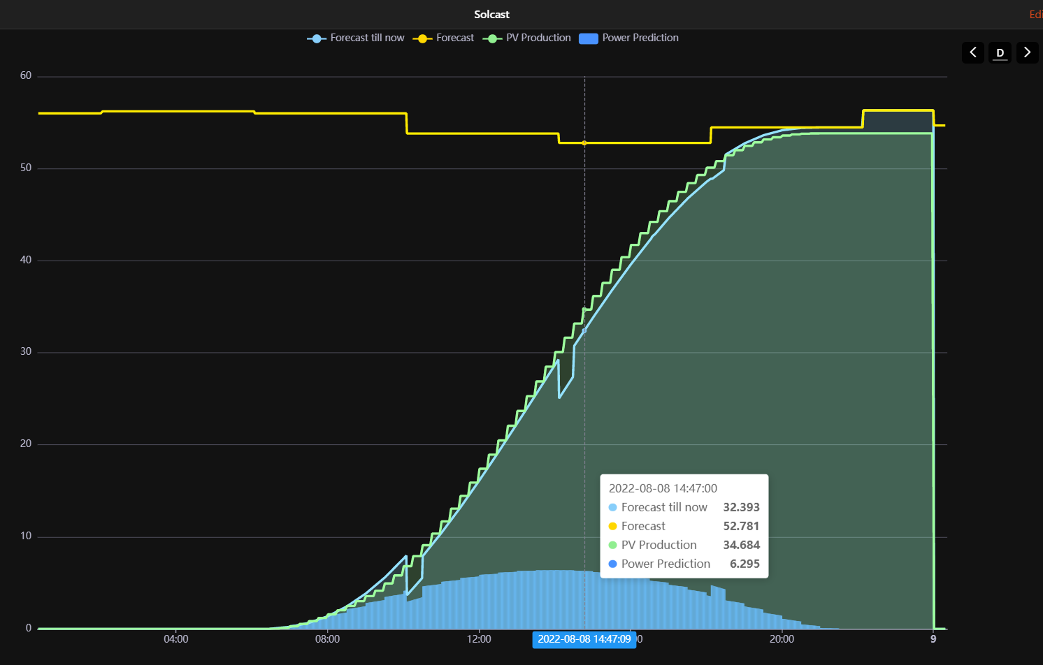 Display Energy values of Forecast and PV inverter items Yellow line shows Daily Total Forecast.